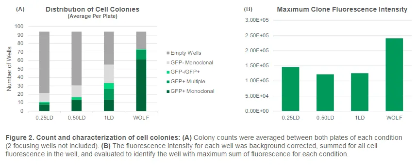 相較于傳統的有限稀釋法,WOLF細胞分選儀在細胞系構建效率上取得了質的飛躍。根據研究數據顯示,采用WOLF細胞分選儀進行單克隆分選實驗后,GFP+單克隆的數量顯著增加了8倍,而最大克隆熒光強度更是接近有限稀釋法的兩倍。這一顯著的提升不僅體現在數量的增長上,更在于單克隆細胞系質量的顯著提升。