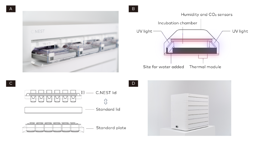 圖1 (A)C.NEST培養(yǎng)系統(tǒng)包含四個(gè)獨(dú)立的腔室。(B)C.NEST培養(yǎng)環(huán)境控制。(C)C.NEST支持靜態(tài)培養(yǎng)和混合培養(yǎng)。(D)C.NEST軟件能同時(shí)控制4臺(tái)儀器。