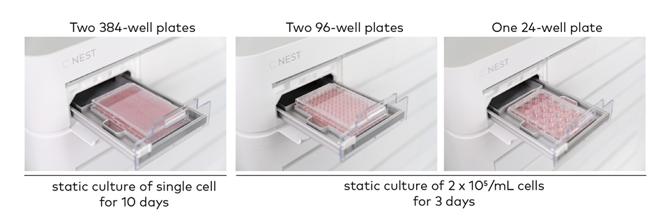 在這里,我們用C.NEST培養(yǎng)了不同規(guī)格的細(xì)胞孔板中的細(xì)胞,并與傳統(tǒng)培養(yǎng)箱中培養(yǎng)的細(xì)胞進(jìn)行了比較。C.NEST靜態(tài)培養(yǎng)時(shí),每個(gè)腔室可以放入兩塊384孔板或兩塊96孔板或一塊24孔板。