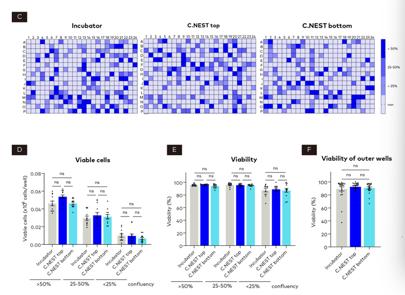 圖3 在 384 孔板中對 C.NEST 與標(biāo)準(zhǔn)培養(yǎng)箱的單細(xì)胞克隆進(jìn)行比較。(A)通過一系列圖像對每個(gè)單細(xì)胞進(jìn)行監(jiān)測。(B)在顯微鏡下觀察克隆(比例尺 = 1 毫米)。將融合度分為 3 個(gè)等級,并評估每個(gè)等級中克隆的數(shù)量和百分比。(C)每組克隆分布的熱圖。(D 和 E)展示了在第 10 天每個(gè)匯合度等級中活細(xì)胞和細(xì)胞活力的代表性數(shù)據(jù)。(F)由于邊緣效應(yīng),對外側(cè)孔的細(xì)胞活力進(jìn)行了確認(rèn)。數(shù)據(jù)使用單因素方差分析(one-way ANOVA)進(jìn)行分析,并以均值±標(biāo)準(zhǔn)誤(mean ± SEM)表示。P 值的顯著性表示為:P≥0.05(無顯著差異,ns),P<0.05(*),P<0.01(**),P<0.001(***),P<0.0001(****)