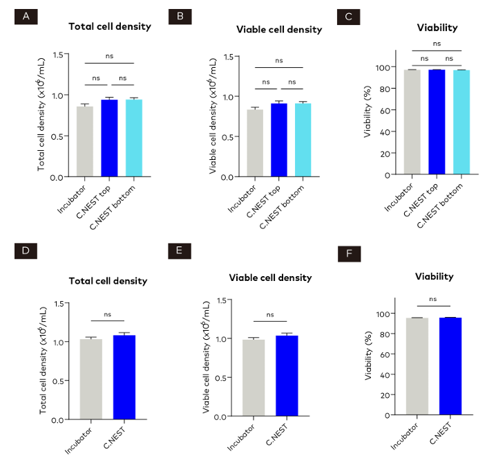 圖4 對比C.NEST和培養(yǎng)箱培養(yǎng)的96孔板和24孔板中的細(xì)胞狀態(tài)。(A-C) 在培養(yǎng)第3天時(shí),對96孔板培養(yǎng)的總細(xì)胞密度、活細(xì)胞密度和活細(xì)胞率進(jìn)行分析。數(shù)據(jù)采用單因素方差分析進(jìn)行分析。(D-F) 在培養(yǎng)第3天時(shí),對24孔板培養(yǎng)的總細(xì)胞密度、活細(xì)胞密度和活細(xì)胞率進(jìn)測量。數(shù)據(jù)采用配對雙尾t檢驗(yàn)進(jìn)行分析。所有數(shù)據(jù)均以平均值±標(biāo)準(zhǔn)誤表示,P值的顯著性以P≥0.05(ns)、P<0.05(*)、P<0.01(**)、P<0.001(***)、P<0.0001(****)表示。