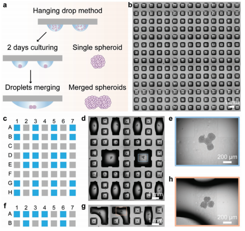 圖1. 可編程液滴融合技術(proMAD)。a)利用親水點被超疏水邊界分隔的小型化液滴微陣列(DMA)形成細胞球體陣列的示意圖。為了實現球體的可編程裝配,通過增加相鄰液滴的體積來合并液滴。b)單個HepG2球體14 × 14陣列顯微鏡圖像。c, f)多液滴在DMA上可控合并的打印方案。使用以下印刷體積:900 nL /液滴,用于融合2或4個液滴;850 nL /液滴,將3個液滴融合在一起((c)和(f)中的藍色點)。d, g)含有2、3和4個合并液滴的DMA顯微鏡圖像。e, h)融合24 h后融合水滴中的4個球體和3個球體圖像