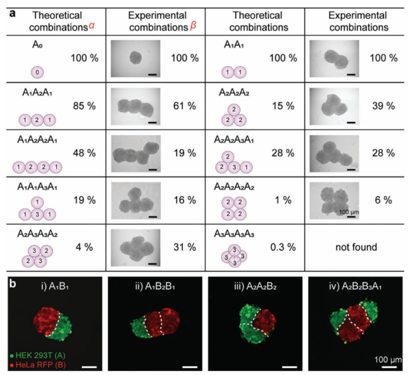 圖2. 由proMAD方法形成的多球體結構的例子。a)不同HepG2多球體的示意圖、概率和相應的例子。“結合數”對應于配合物的各個球體之間的結合位點的數量,顯示在方案上的每個球體中。α,在理論模型中,將細胞球體視為球體,并通過模擬算法給出組合概率。β,組合概率由實驗統計得出(3個球體,n = 33, 4個球體,n = 32)。b)兩種不同細胞系(表達RFP和HEK 293T的HeLa細胞用綠色熒光5-氯甲基熒光素雙乙酸酯染色)合并后24小時構建的異球結構的熒光顯微鏡圖像:A1B1,A1B2B1,A2A2B2和A2B2B3A1。