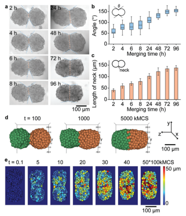 圖3. 兩胞球體融合過程的實驗與模擬研究。a)兩個HepG2球體初次接觸96小時后融合的亮場顯微鏡圖像。b)合并球體間夾角隨時間變化的曲線圖。(a)中的藍色虛線表示角度。c)顯示合并球體隨時間變化的頸部長度(橙色虛線顯示在(a)中)的圖。(b)和(c)中的誤差條表示10個不同合并球體的SD。d)兩個球體(球體直徑150μm, 400個細胞)融合過程的三維模擬。e)熱圖顯示融合過程中單個細胞的時空運動。彩色地圖表示每個細胞相對于其初始位置的位移(t = 0)。kMCS是時間尺度,代表kilo Monte Carlo sweep。