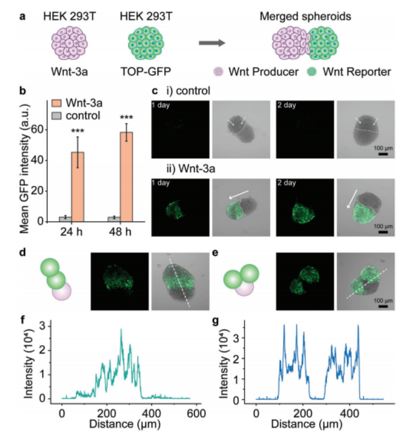 接下來,研究測試了Wnt信號在三重球體復合體中的傳播,將兩個報告球體與一個產生Wnt-3a的球體合并,然后選擇兩種不同的融合球體架構進行分析。在第一種結構中,兩個報告球體呈線性結構排列,產生Wnt的球體位于一端(圖5d)。與產生Wnt直接相鄰的報告球體被強烈激活,而位于遠端的報告球體被不那么強烈激活(圖5d,f)。在第二種組合中,兩個報告球體位于生產者球體的兩側,顯示出兩個報告球狀體在同等程度上的強烈激活(圖5e,g)