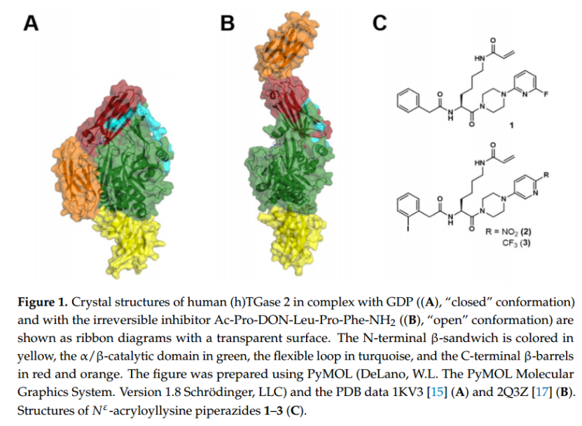 由于細(xì)胞內(nèi) GTP(≈100–150 μM)和 Ca2+(≈0.1 μM)濃度,TGase 2 在細(xì)胞內(nèi)采用與“閉合”構(gòu)象相關(guān)的構(gòu)象,因此在生理?xiàng)l件下被認(rèn)為基本上不具有轉(zhuǎn)酰胺酶活性 [31–33]。在與 Ca2+ 穩(wěn)態(tài)喪失相關(guān)的生理應(yīng)激情況下,會發(fā)生向“開放”構(gòu)象的構(gòu)象重塑;事實(shí)上,Ca2+ 水平會升高,蛋白質(zhì)會變得具有轉(zhuǎn)酰胺酶活性 [31,32]。而轉(zhuǎn)酰胺酶TGase 2 主要在細(xì)胞外環(huán)境中發(fā)揮 TGase 活性,并被認(rèn)為與纖維化 [34–37]和乳糜瀉 [38,39] 等病理生理過程有關(guān)。各種腫瘤實(shí)體的特征是 TGase 2 表達(dá)增加,這與不良預(yù)后有關(guān) [40]。此外,TGase 2 似乎對癌癥干細(xì)胞的存活至關(guān)重要 [41–44]。這使得 TGase 2 成為治療診斷方法中一個(gè)有吸引力的腫瘤相關(guān)靶點(diǎn),主要關(guān)注轉(zhuǎn)酰胺酶活性導(dǎo)向的共價(jià)抑制劑,其誘導(dǎo) TGase 2 構(gòu)象重塑為“開放”構(gòu)象。通過這些藥物的作用,轉(zhuǎn)酰胺酶活性受到抑制,GTP 的結(jié)合受到阻斷 [45–47]。此外,有人認(rèn)為這種構(gòu)象重塑本身具有細(xì)胞毒性 [48,49]。因此,評估新化合物對 TGase 2 構(gòu)象動(dòng)力學(xué)的影響非常重要。