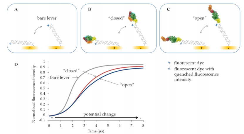一種用于此類評估的新興技術(shù)是 switchSENSE®,如圖 2 所示。這種動(dòng)態(tài)方法基于金電極上的電驅(qū)動(dòng) DNA 杠桿與高度時(shí)間分辨的熒光檢測相結(jié)合。除了多聚陰離子性質(zhì)外,杠桿理想情況下還應(yīng)具有盡可能大的機(jī)械剛度。因此,在大多數(shù)情況下,雙鏈 (ds) DNA [50–52],在某些情況下,特別是當(dāng)需要驅(qū)動(dòng)較重的蛋白質(zhì)時(shí),甚至更硬的 DNA 折紙結(jié)構(gòu)也被用作杠桿 [53,54]。為了在表面上制備此類致動(dòng)器,金電極用硫醇修飾的單鏈 (ss) DNA 寡核苷酸進(jìn)行功能化。這些 ssDNA 鏈中的每一條都在其硫醇部分的對面末端帶有熒光團(tuán)。在本研究中,第一步,通過表面結(jié)合寡核苷酸與互補(bǔ) ssDNA 鏈雜交形成 48 個(gè)堿基對長的 dsDNA 桿(圖 2A)。然后,通過電觸發(fā)時(shí)間相關(guān)單光子計(jì)數(shù) (E-TCSPC) 記錄所得的 16.3 nm 長的裸 dsDNA 桿的運(yùn)動(dòng)。當(dāng)分別通過向電極施加正或負(fù)電位使桿被電極吸引或排斥時(shí),這種動(dòng)態(tài)模式能夠以 100 ns 的時(shí)間分辨率檢測熒光強(qiáng)度。熒光強(qiáng)度與熒光團(tuán)與金表面的距離相關(guān)。由于能量轉(zhuǎn)移,隨著熒光團(tuán)與金表面之間距離的減小,熒光不斷猝滅。 [55]
