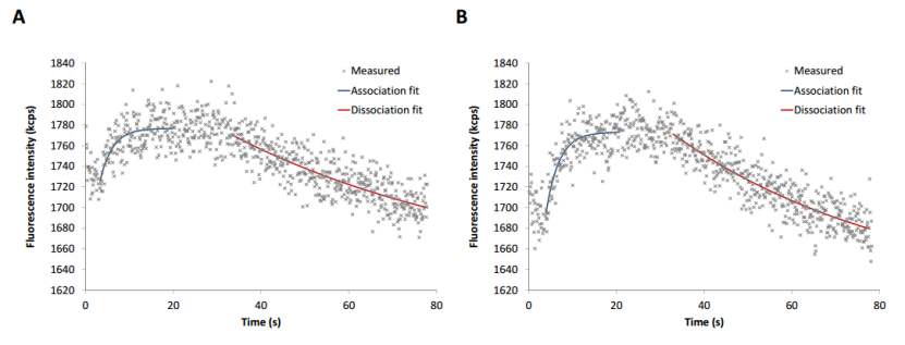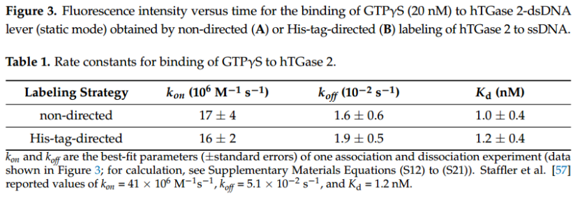 為了評估兩種標(biāo)記類型的 GTPγS 結(jié)合動(dòng)力學(xué)和 hTGase 2 伴隨的構(gòu)象變化,首先應(yīng)用靜態(tài)模式。為此,將 20 nM GTPγS 沖洗到電極上。在 GTPγS 存在下,熒光信號增加(結(jié)合,圖 3);通過去除核苷酸,熒光信號降低(解離,圖 3)。兩個(gè) hTGase 2-dsDNA 杠桿的曲線模式相似。然而,與非定向標(biāo)記(圖 3A)相比,His 標(biāo)簽定向標(biāo)記(圖 3B)提供了略高的熒光增加,同時(shí)伴有更高的信噪比。根據(jù)方程 (5) 和 (8) 進(jìn)行回歸分析(參見材料和方法)給出了結(jié)合和解離的速率常數(shù)。解離常數(shù) Kd 總結(jié)在表 1 中。兩種標(biāo)記類型都產(chǎn)生了可比的動(dòng)力學(xué)參數(shù),Kd 值與 Staffler 等人在類似條件下獲得的值一致 [57]。