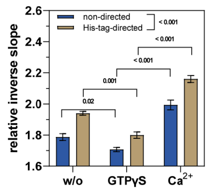 通過比較不同標(biāo)記類型的結(jié)果,可以明顯看出 His 標(biāo)簽引導(dǎo)標(biāo)記產(chǎn)生的相對倒數(shù)斜率值明顯更高(p < 0.001)(圖 4)。這與在靜態(tài)模式下評估的 GTPγS 結(jié)合動(dòng)力學(xué)的結(jié)果一致(圖 3)。因此,TGase 2 與 ssDNA 的位點(diǎn)選擇性偶聯(lián)(此處通過 His 標(biāo)簽引導(dǎo) DNA)對 switchSENSE® 兩種測量模式的數(shù)據(jù)質(zhì)量都有積極影響,Staffler 等人最近也提出了這一建議 [57]。特別是對于 TGase 2,靠近 N 端的功能化是有利的,因?yàn)樵谟?GTP 類似物和 Ca2+ 刺激時(shí),N 端 β 夾層較少參與構(gòu)象重塑。但是,如上所述,His 標(biāo)簽引導(dǎo)標(biāo)記的主要缺點(diǎn)是制備結(jié)合物期間產(chǎn)量低。因此,我們決定利用非定向標(biāo)記獲得的 hTGase 2-ssDNA 進(jìn)行抑制劑 1-3 的構(gòu)象影響實(shí)驗(yàn)。