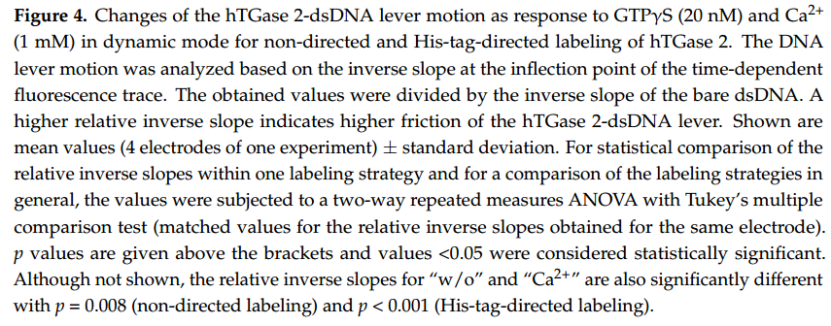 事實(shí)上,在存在 GTPγS 的情況下,相對逆斜率明顯小于純緩沖液中不含 GTPγS 的情況(圖 4),因?yàn)橐阎?GTP 類似物會使 TGase 2 的構(gòu)象動(dòng)力學(xué)向“閉合”構(gòu)象轉(zhuǎn)變(圖 1A)。隨后去除 GTPγS 并暴露于 Ca2+ 會增加相對逆斜率,甚至超過在沒有任何效應(yīng)物的情況下 hTGase 2-dsDNA 杠桿的值(圖 4;有關(guān)動(dòng)力學(xué),請參閱補(bǔ)充材料中的圖 S2)。這反過來又與最近的數(shù)據(jù)一致,表明 Ca2+ 的結(jié)合有利于 TGase 2 形成相當(dāng)細(xì)長的構(gòu)象 [18–20,29,32],這應(yīng)該會增加 DNA 杠桿的摩擦力(圖 2B)。在這種情況下,TGase 2 的構(gòu)象重塑可能是各種中間構(gòu)象的動(dòng)態(tài)平衡,這有助于 hTGase 2-dsDNA 杠桿的摩擦力。因此,在沒有任何效應(yīng)器的情況下,觀察到的摩擦力大概是中等強(qiáng)度的。