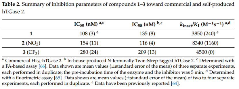 在分析抑制劑 1–3 對 TGase 2 構(gòu)象動(dòng)力學(xué)的影響之前,必須評估它們的抑制效力。雖然之前已顯示化合物 1 具有出色的抑制效力 [64],但化合物 2 和 3 代表新化合物。使用熒光測定法測定 2 和 3 的動(dòng)力學(xué)抑制效力 [65],結(jié)果顯示 kinact/KI 值分別為 8340 M?1 s ?1 和 4500 M?1 s ?1 (表 2)。此外,在蛋白質(zhì)和抑制劑預(yù)孵育 5 分鐘后,用熒光各向異性 (FA) 分析法測定了抑制轉(zhuǎn)酰胺酶活性的 IC50 值(2 和 3 分別為 154 和 280 nM,表 2)[64,66]。對于 SDS-PAGE 和天然 (GTP-)PAGE 實(shí)驗(yàn),我們使用了自制的 Twin-Strep 標(biāo)記的 hTGase 2,該酶被化合物 1-3 抑制,其 IC50 值在市售的 His 標(biāo)記的 hTGase 2 的范圍內(nèi)(表 2,補(bǔ)充材料中的圖 S3)