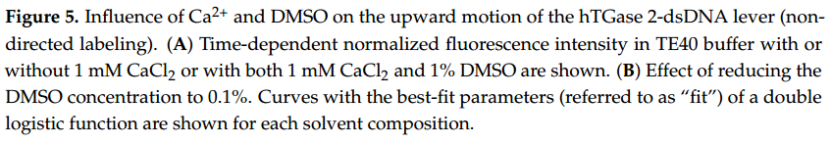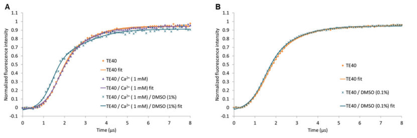 由于溶解度有限,抑制劑 1–3 的儲備溶液通常在 DMSO 中制備,因此用于生化和生物測定的最終 DMSO 濃度在 0.1% 至 5% 之間。為了確定 DMSO 的潛在干擾,我們使用不同的溶劑成分評估了裸露 DNA 桿的向上運(yùn)動(dòng)(圖 5)。雖然施加濃度為 1 mM 的 Ca2+ 不會改變時(shí)間依賴性熒光曲線的形狀,但與純水條件相比,1% DMSO 會導(dǎo)致曲線左移(圖 5A)。幸運(yùn)的是,當(dāng) DMSO 濃度降低到 0.1% 時(shí),曲線的形狀與水條件下的形狀基本相同(圖 5B)。因此,對于所有使用抑制劑 1–3 的 switchSENSE® 實(shí)驗(yàn),最終 DMSO 濃度均設(shè)置為 0.1%。目前無法給出觀察到 DMSO 影響的原因,但結(jié)果強(qiáng)調(diào)了仔細(xì)評估溶劑成分以避免測量偽影的必要性。