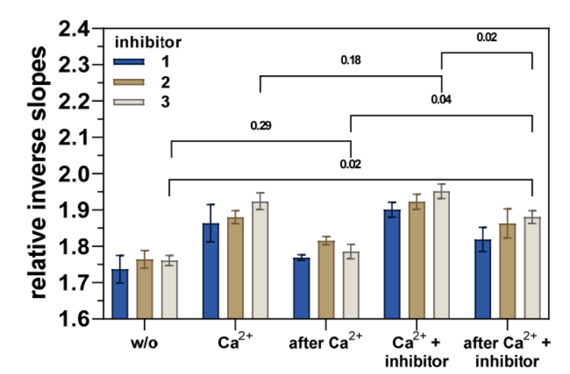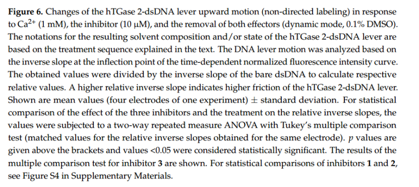 圖 6 顯示了相對倒數(shù)斜率對 hTGase 2-dsDNA 杠桿向上運(yùn)動(dòng)的影響。如前所述(圖 4),添加 Ca2+ 會增加摩擦力,因此,hTGase 2-dsDNA 杠桿的時(shí)間依賴性歸一化熒光強(qiáng)度曲線中的相對倒數(shù)斜率也會增加,在去除 Ca2+ 后,該曲線幾乎與添加 Ca2+ 之前相同(差異不具有統(tǒng)計(jì)學(xué)意義,圖 6 和 S4)。同時(shí)添加 Ca2+ 和抑制劑似乎會使摩擦力增加到比單獨(dú)添加 Ca2+ 更高的值(但這種差異對于所有抑制劑而言都不具有統(tǒng)計(jì)學(xué)意義,補(bǔ)充材料中的圖 6 和 S4)。對于抑制劑 3,隨后去除 Ca2+(“Ca2+ + 抑制劑之后”)會使摩擦力降低到與單獨(dú)添加 Ca2+(“Ca2+”)相似的水平,但與“w/o”和“Ca2+ 之后”相比仍顯著更高(圖 6)。對于抑制劑 1 和 2,這種趨勢相似;然而,應(yīng)該注意的是,“Ca2++ 抑制劑后”與“w/o”和“Ca2+ 后”的差異中只有部分具有統(tǒng)計(jì)學(xué)意義(補(bǔ)充材料中的圖 S4)。因此,數(shù)據(jù)可能表明這三種抑制劑在不可逆結(jié)合后將 hTGase 2 的構(gòu)象平衡轉(zhuǎn)變?yōu)楦煺沟臉?gòu)象。Staffler 等人 [52] 最近使用 switchSENSE® 對肽類不可逆抑制劑 Z-DON-Val-Pro-Leu-OMe(“Z-DON”)獲得了類似的結(jié)果。面對不同條件之間相對逆斜率的輕微變化以及隨著治療周期的增加電極的某些老化效應(yīng),有必要使用互補(bǔ)方法來可視化由于配體的共價(jià)或非共價(jià)結(jié)合而導(dǎo)致的 hTGase 2 的構(gòu)象變化。