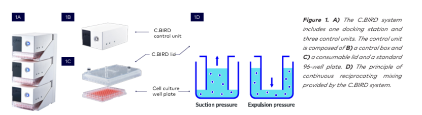 高通量技術正越來越多地應用于細胞培養實驗(CLD)流程中。這些技術能在小規模的培養皿/試管中提供懸浮培養環境,并增強氧氣供應。在本研究中,我們展示了一種新的系統,即 C.BIRD 微生物反應器系統,它能夠在標準的 96 孔板中實現早期階段的懸浮細胞培養。C.BIRD 系統結構緊湊,易于放入標準培養箱中。它有一個對接站,可容納三套 C.BIRD 系統(圖 1A)。該系統由兩部分組成:頂部的自主控制箱(圖 1B)和帶有 96 個圓柱形管的消耗性 C.BIRD 蓋子(圖 1C)。C.BIRD 蓋子上的管子提供了 96/24 個液流通道,使得在標準細胞培養板中的每個孔都能吸入和排出空氣。這些通道與氣動連接,并由控制系統驅動,從而在 96 孔板中每個孔內實現 150 - 200 μL 工作體積的連續往復混合(圖 1D)。有了 C.BIRD,就可以在 96 孔板中實現體積小至 150 - 200 μL 的細胞培養規模的三維懸浮培養環境。C.BIRD 可以模擬振蕩器的作用。在良好的細胞培養環境以及從早期階段就加速細胞系分化(CLD)進程的情況下,從而為細胞更好地生長以及克隆特征的可預測性提供了新的可能性。