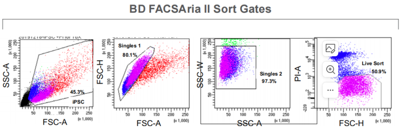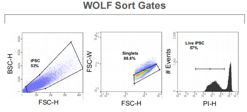WOLF柔性單細胞分選儀是一種溫和的低壓(<2 psi)微流控細胞分選儀。使用低壓細胞分選儀可以降低細胞上的剪切應力,從而使細胞更健康、更完整、活率更高,分選后的RNA完整性更高。WOLF還使用可拋棄式分選芯片,使樣品和鞘液接觸的所有東西都是無菌的,一次性的,并且不受樣品間污染。為了證明這種溫和的無菌細胞分選儀如何10x基因組學工作流程中的有時,我們將未分選的iPSC樣品制備與在NanoCellect WOLF或BD FACSAria?II上分選的iPSC樣品進行了比較。