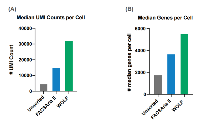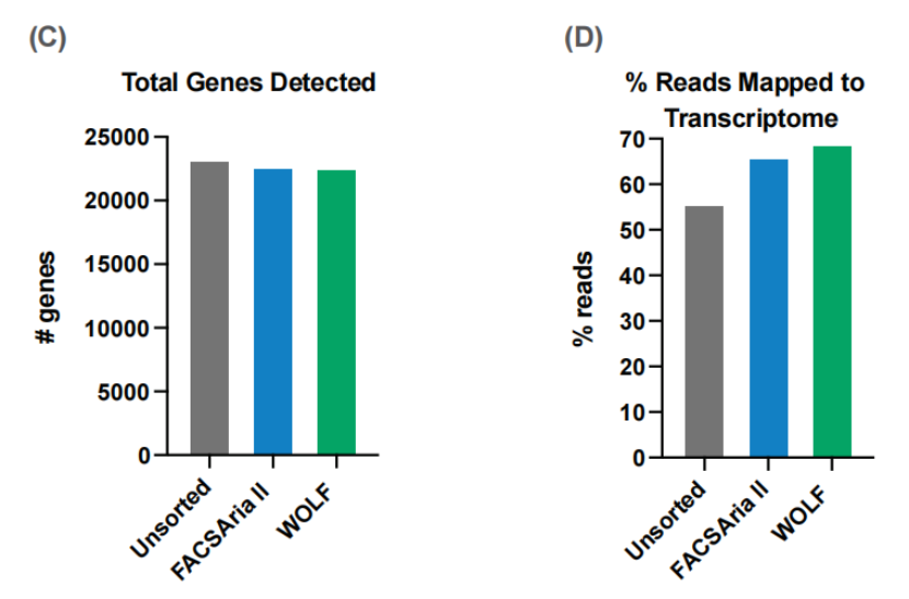 該實驗表明,在10x基因組學應用程序的上游使用細胞分選儀可以提高文庫的復雜性。盡管在WOLF和Aria分選的樣本中,文庫的復雜性都得到了改善,但顯然WOLF的改善更為顯著,可以幫助我們獲得更多的數據。此外,即使這些結果表明檢測到的基因數量相似,但仍有較高的能夠映射到參考轉錄組的reads的百分比。這表明分選的樣品中污染較少,數據的可信度更高。