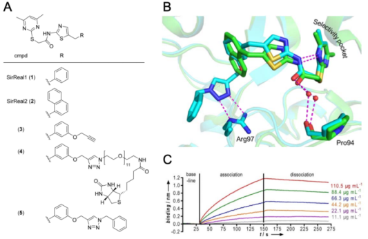 Sirt2的功能失調和多種疾病的發生相關,包括細菌感染,類型II糖尿病,神經退行性疾病和腫瘤,提示Sirt2有希望成為一個藥物干預的靶點。然而,對于一些疾病,包括亨廷頓氏病以及一些類型的腫瘤,還未最終被明確Sirt2是被上調,還是被下調或者被抑制,進而改善特定的疾病狀態。由于迫切需要合適的工具化合物來進一步研究 Sirt2 去乙酰化對細胞的影響,并驗證 Sirt2 作為藥物靶點的潛力,因此人們發現了多種具有藥物特性的 Sirt2 選擇性小分子抑制劑。最近,我們已經發現了一類新的Sirt2高度選擇性抑制劑(請見Figure 1A).這些化合物在較低的uM到nM濃度范圍內抑制Sirt2, 然而對于它的相近的同源物Sirt1和Sirt3卻沒有檢測到抑制效應(IC50>100uM)。