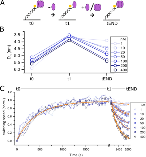 圖1. TNF-a的單體化和再三聚動力學。通過與表面束縛的互補DNA鏈雜交來固定化TNF-a-DNA結(jié)合物,通過緩沖液流進行單體化,然后重新三聚化(A)。通過測量流體動力學直徑,確定固定化的TNF-a(t0)、單體化復合物(t1)和與納摩爾濃度的自由TNF-a作用的復合物(tEnd)的尺寸(B)。在初始狀態(tài)下,固定化的TNF-a的尺寸確定產(chǎn)生5.6±0.1nm的流體動力學直徑,而在緩沖液流動2000 s后,確定較小的尺寸,對應于3.9±0.1nm的單體TNF-a。注射更高納摩爾濃度的自由TNF-a可誘導有效的三聚體形成,使轉(zhuǎn)變成為一個可逆的過程。單體化動力學的單指數(shù)模擬得到的單體化速率為1.66±0.25 E-3 s-1(C,橙色實心線,t0至t1)。高納摩爾濃度的自由TNF-a導致在不到600 s內(nèi)快速重新三聚化(C,t1至tEnd)。