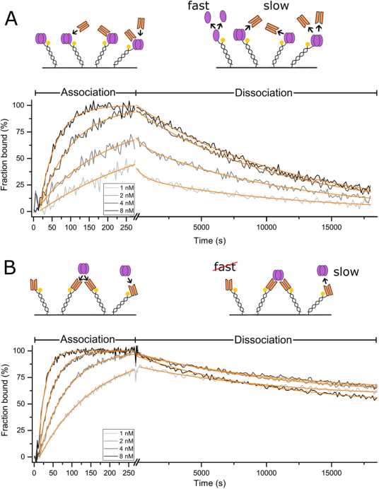 首先,我們研究了單價阿達木單抗Fab在兩個方向上與三聚體TNF-a結(jié)合的更簡單情況。在相反的試驗方向中,阿達木單抗Fab與固定化三聚體TNF-a的結(jié)合動力學(圖2A)可以通過單指數(shù)函數(shù)描述。與固定配體的每個結(jié)合事件都是獨立檢測的,這對應于1:1的相互作用。Fabs從部分飽和表面(注射1和2 nM Fab)的分解動力學是雙相的,具有快速和緩慢的速度,分別為kFast=1.42±0.39 10- 3s-1和kSLOW =8.52±0.28 10- 5s-1(圖2A和S3)??焖俚姆蛛x率類似于之前確定的TNF-a單聚化率,并且很可能源于未被結(jié)合的Fab穩(wěn)定的TNF-a三聚體的衰變。緩慢的速度可以歸因于Fab與固定化的TNF-a三聚體的分離,這可以通過與圖*中相反的檢測方向進行比較來看出。在這里,發(fā)現(xiàn)了與固定化阿達木單抗Fab的分離率相同的速率。正如預期的那樣,沒有觀察到快速單體化。相反,可觀察到的動力學表明第三個甚至更慢的分解過程,這是可感知的,因為信號在18,000秒的運行時間內(nèi)沒有接近基線。這可以用親合效應來解釋,即兩個或三個固定的阿達木單抗Fab通過一個緊密結(jié)合的三聚體TNF-a相互連接。已知固定阿達木單抗Fab的多價結(jié)合形成高度穩(wěn)定的復合物。