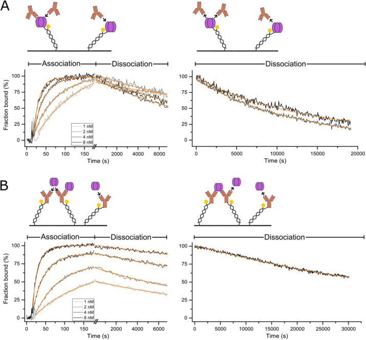 圖3. TNF-a-阿達木單抗相互作用。以反向(固定化的TNF-a,A)和正向試驗方向(固定化的阿達木單抗IgG,B)記錄了TNF-a與阿達木單抗的相互作用。記錄的關聯(lián)時間為160秒,分離時間為7200秒。此外,對于最高分析物濃度,記錄了18,000 s(A)和30,000 s(B)的更長的分解階段。分析物溶液以1、2、4、8 ns(淺灰色至黑線)的濃度進樣。橙色線代表適合數(shù)據(jù)。