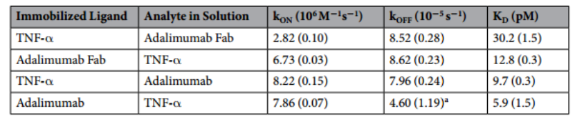 表1列出了確定的TNF-a和阿達木單抗Fab/完整阿達木單抗抗體之間相互作用的動力學速率和親和力。溶液中固定化阿達木單抗IgG和TNF-a的解離速率常數(shù)與已發(fā)表的數(shù)據(jù)完全一致。作為一個重要的結(jié)果,我們觀察到兩種檢測方向的一致親和力和相似的速率,首次表明方向不會顯著影響結(jié)合模式及其親和力。
