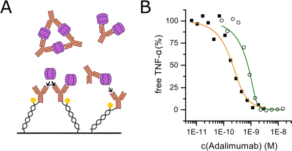 作為之前描述的結(jié)合動力學測量的補充方法,我們通過溶液滴度進行了親和力測量,這排除了由于固定化過程而可能出現(xiàn)的偽影。將TNF-a和抗體以不同比例混合在溶液中并允許結(jié)合。平衡后,生物傳感器以濃度測量模式測量未結(jié)合的TNF-a的剩余分數(shù)。在這里,我們使用固定化阿達木單抗來檢測在具有恒定濃度的TNF-a和增加濃度的阿達木單抗預孵育的溶液中剩余的具有結(jié)合能力的TNF-a(-復合物)(圖4A)。進行此類實驗的困難在于兩種結(jié)合劑的多價性(TNF-a三聚體= 3,阿達木單抗= 2),這導致形成更高級的復合物,正如之前所描述的那樣(形成由三個阿達木單抗IgGs互連的三個TNF-a三聚體)。由多個TNF-a和多個阿達木單抗分子組成的幾種不同復合物可以被表面束縛的阿達木單抗結(jié)合,這就是為什么圖4A中采用的簡單1:1匹配模型低估了劑量反應的陡峭性,只能被認為是一種近似。此外,TNF-a的濃度應該在生物學相關范圍內(nèi)(必須存在三聚體),但要低到足以仍然到達KD敏感區(qū)域。對于這里的實驗,選擇c(TNF-a)為100 pM和500 pM。溶液親和力測量證實了動力學實驗中確定的解離常數(shù),KD(c(TNF-a)= 100 pM)= 53.6±29.5 pM; KD(c(TNF-a)= 500 pM)< 30.0 pM)(圖4 B)。