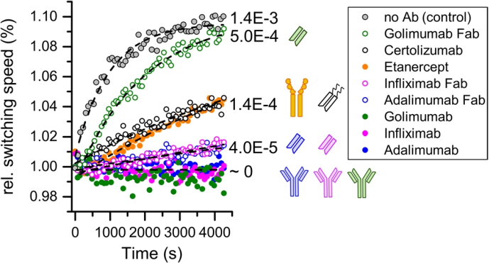 在表征多價性對TNF-α-阿達木單抗/阿達木單抗Fab相互作用中相互作用參數(shù)的影響后,我們研究了TNF-α與5種不同抗TNF-α抗體及其Fab片段復合物的單體化。為此,將TNF-α固定在傳感器表面上,并用5 nM相應的TNF-α清除劑飽和。然后,將表面連續(xù)暴露于TNF-α清除劑(5 nM)以確保清除劑不能有效地從表面解離。這樣,轉(zhuǎn)換速度信號的增加表明清除劑結(jié)合的TNF-α的衰減,但不是清除劑解離。開關速度監(jiān)測70分鐘。觀察到所有的TNF-a狂熱結(jié)合物(阿達木單抗、英夫利西單抗、戈利木單抗)的單體化完全抑制(轉(zhuǎn)換速度沒有增加),這些結(jié)合物可以形成相互關聯(lián)的多重結(jié)合復合物(圖5,純藍色、品紅色和綠色符號)。阿達木單抗和英夫利西單抗的這些發(fā)現(xiàn)與文獻一致。然而,在FRET試驗中,與戈利木單抗復合物中,TNF-a單體化速度更快被發(fā)現(xiàn)。我們僅在源自戈利木單抗的Fab片段中觀察到這種行為,其對單體化的抑制最弱(圖5,開放綠色符號)。與自由單體化率(圖5,灰色符號)相比,與戈利木單抗Fab復合的率僅降低了三倍。相比之下,來自阿達木單抗和英夫利西單抗的Fab片段對單體化表現(xiàn)出更強的抑制作用(圖5,空心藍色和品紅色符號)。受控消化抑制了相互連接,但英夫利西單抗Fab和阿達木單抗Fab的單聚率仍然剛剛提高到可檢測水平(kMONO=4.0E-5 s-1)(圖5,空心藍色和品紅色符號)。Van Schie還描述了在Certolumab存在下的中等快速單體化。Scallon等人發(fā)現(xiàn),在Etanercept的存在下,放射性標記的TNF-a可以快速替代。在這里,兩種不代表完整抗體的治療形式,即塞爾托珠單抗和依那西普,都顯示出中等快速的單體化(圖5,分別是空心黑色和實心橙色符號)。