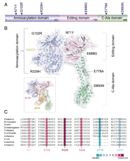 AlaRS在CMT相關的aaRSs中也是獨一無二的,因為它包含一個校準域,位于N端的氨酰化域和C端的C-Ala域之間(請見Fig. 1A)。AlaRS的氨酰化域對于tRNA和其同源氨基酸丙氨酸的結合是必要且充分的。它不僅包含催化活性位點同時也包括關鍵的負責識別tRNAAla的主要特性元件,這是一個位于接受鏈莖段中的 G3:U70 型錯配堿基對。然而由于丙氨酸和其他氨基酸,例如絲氨酸和谷氨酸,的高度相似性,AlaRS的活性位點在選擇同源氨基酸方面是欠缺的。因此,一個校準域被引入AlaRS中,以糾正這種發生的錯誤。AlaRS水解校準功能的重要性已經得到廣泛的證實,因為哪怕是最輕微的校準缺陷將會導致嚴重的疾病。人的AlaRS的C-Ala域的功能還不清楚。在原核AlaRS中,C-Ala幫助tRNA的結合,因此提高了酶的活性,然而,人的AlaRS失去了該功能。
