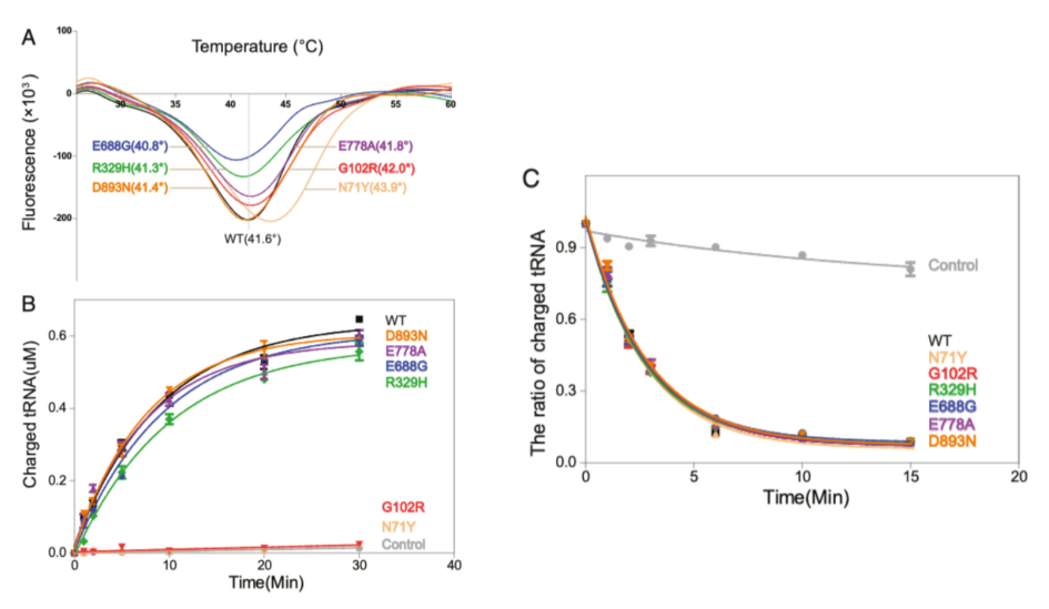 我們首先明確CMT突變是否影響AlaRS的單體狀態。重組的帶有His-標簽的AlaRS野生型和六個CMT突變蛋白在大腸桿菌中過表達和純化。所有的蛋白都具有相似的產出,表明CMT突變不影響AlaRS的穩定性。凝膠過濾層析法分析確認人的AlaRS主要作為單體存在,CMT突變不改變AlaRS的單體狀態,我們也進行了基于熒光的熱遷移分析法(TSAs)。所有蛋白的溶解溫度(Tm)在1度之內,除了N71Y,它在溶解溫度上增加了2.3度,表明更高的穩定性(請間Fig. 2A)。因此CMT突變不影響蛋白的穩定性。