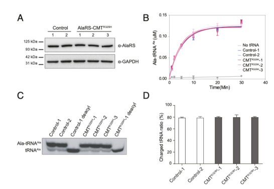 Fig. 3 攜帶有AlaRS R329H突變的CMT病人細胞在tRNA氨酰化功能上沒有缺失
