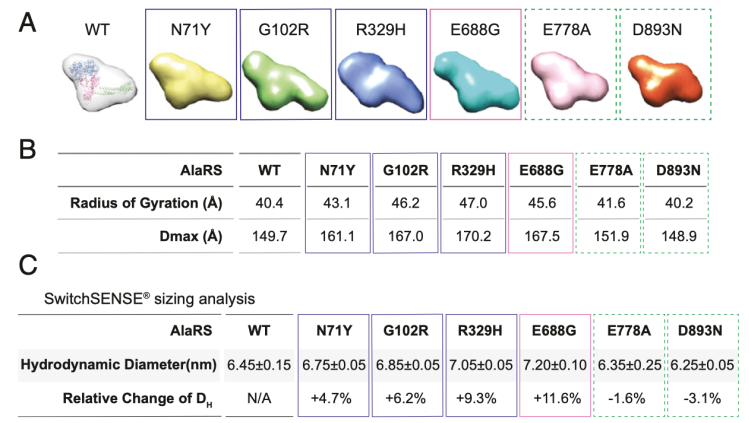 我們也使用了switchSENSE技術評估了AlaRS蛋白的流體動力學半徑。這種方法是將短的雙鏈DNA一端固定在金屬表面,另一端以單鏈DNA的形式結合熒光探針,另一條單鏈結合感興趣的蛋白。DNA由芯片表面的電極驅動而上下擺動。一旦DNA鏈和蛋白偶聯,DNA雙鏈的流體動力學摩擦系數受到影響,進而影響DNA納米桿的運動,該運動速度可以用于評估蛋白流體動力學半徑。再次,我們發現除了C-Ala域的突變,所有的CMT突變,都比野生型的AlaRS具有更大的半徑(請見Fig. 5C)。