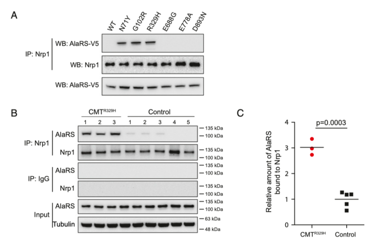 先前的研究表明,在tRNA合成酶中CMT突變誘導的結構開放性能使得在翻譯機制外發生異常的相互作用,有助于疾病的發生。例如,在GlyRS中CMT突變導致了合成酶和跨膜受體Nrp1異常的相互作用。有趣的是,雖然野生型的AlaRS不能與Nrp1發生互作,三個在氨酰化域的突變能夠誘導蛋白與受體發生異常的互作(Fig. 6A)。然而,不僅C-Ala域突變而且校準域突變都不能誘導與Nrp1的相互作用(請見Fig. 6A)。使用病人來源的淋巴細胞和正常個體來源的細胞相比,我們確認了攜帶R329H突變的病人中存在AlaRS和Nrp1的相互作用(請見Fig. 6B和C)。