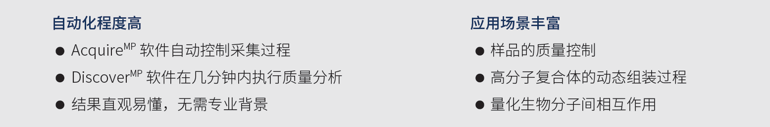 Refeyn Two MP 是一臺基于質量光度法 (MP)臺式單分子質量分析系統,它機身緊湊安裝簡單。只需要消耗幾微升樣品和干凈的玻片即可直接測量溶液中單個分子質量,且無需任何標記,為生物分子檢測帶來無限可能。