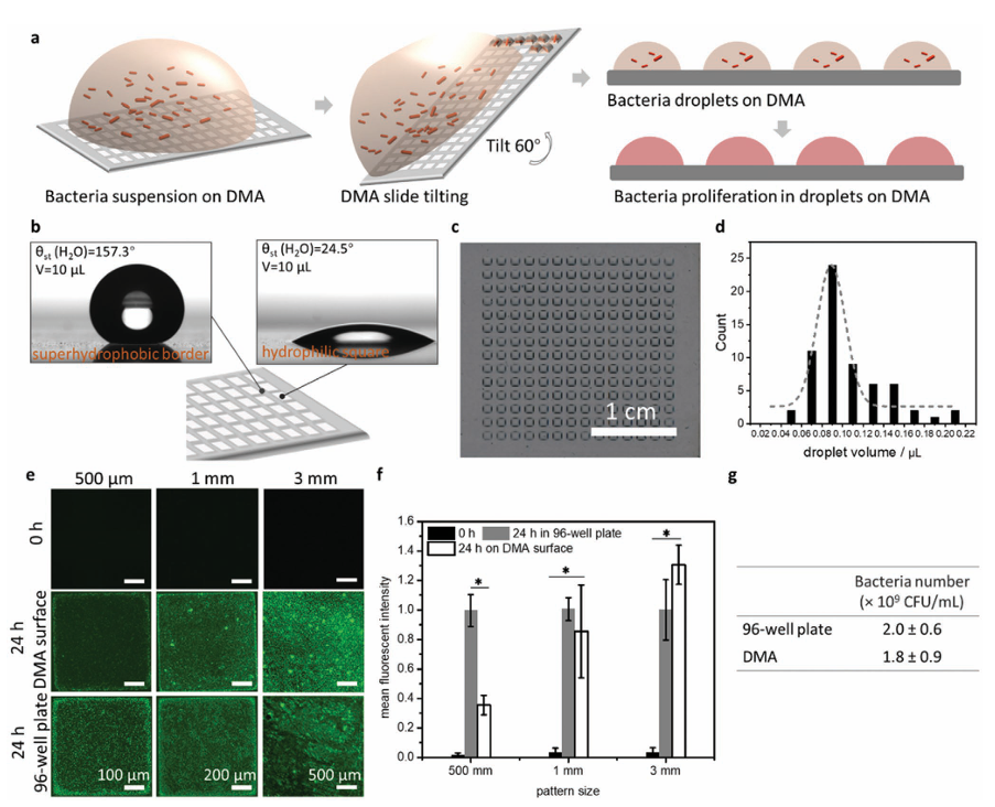 圖 1展示了在 DMA 滑片上細菌接種和增殖的示意性圖示。將水溶液涂布于該滑片上,由于親水性方形區域與超疏水邊界之間的潤濕性差異,水溶液會自發地形成一系列分離的微滴(圖 1b)。將 1.5 毫升細菌懸液置于超疏水親水性陣列上 30 秒,然后將滑片傾斜以形成含有細菌的微滴。每個 DMA 玻片(7.5 × 2.5 厘米)包含三個含有 196 個親水性方形區域的微陣列圖案區(圖 1c)。使用一個 DMA 玻片,在幾秒鐘內形成了 588 個微滴,每個微滴代表一個單獨的陣列區,用于后續的抗菌測試。