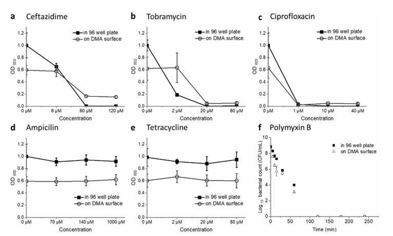 作為一個抗生素篩選平臺,DMA 應該能給出與基于微孔板方法所獲得的結果相當的數據。因此,我們對五種抗生素的 MIC(最小抑菌濃度)進行了研究,研究對象是 P. aeruginosa PAO1 菌株,在 DMA 表面以及 96 孔板中進行檢測。MIC 是指能夠在基于 OD600 值測定的隔夜實驗中抑制細菌生長的抗菌化合物的最低濃度。如圖 3 所示,頭孢他啶在 DMA 玻片和 96 孔板上的 MIC 值均在 6 - 60 μm 范圍內。環丙沙星在 DMA 滑片和 96 孔板上的 MIC 值均在 0 - 1 μm 范圍內。妥布霉素在 DMA 滑片上的 MIC 值在 2 - 20 μm 范圍內,而在 96 孔板中的 MIC 值在 0 - 2 μm 范圍內,盡管這些數值與 EUCAST 數據庫中列出的 MIC 值范圍(0 - 68 μm)一致。氨芐西林和四環素在 DMA 滑片和 96 孔板中的實驗中均未顯示出對 P. aeruginosa PAO1 有效的抗菌作用。還對多粘菌素 B 在 DMA 滑片和 96 孔板上的抗菌效果的時間依賴性進行了研究。如圖 3f 所示,在 DMA 滑片和 96 孔板中,暴露于聚麥迪霉素 B 后活菌數量隨時間呈時間依賴性減少,使所有細菌失活,在最初的 2 小時孵育中,在 DMA 滑片上的小液滴體積不影響聚麥迪霉素 B 對銅綠假單胞菌 PAO1 的抗菌效果的動力學。這些觀察結果證實了在 DMA 滑片上的小液滴體積不會影響聚麥迪霉素 B 對銅綠假單胞菌 PAO1 的抗菌效果的動力學。