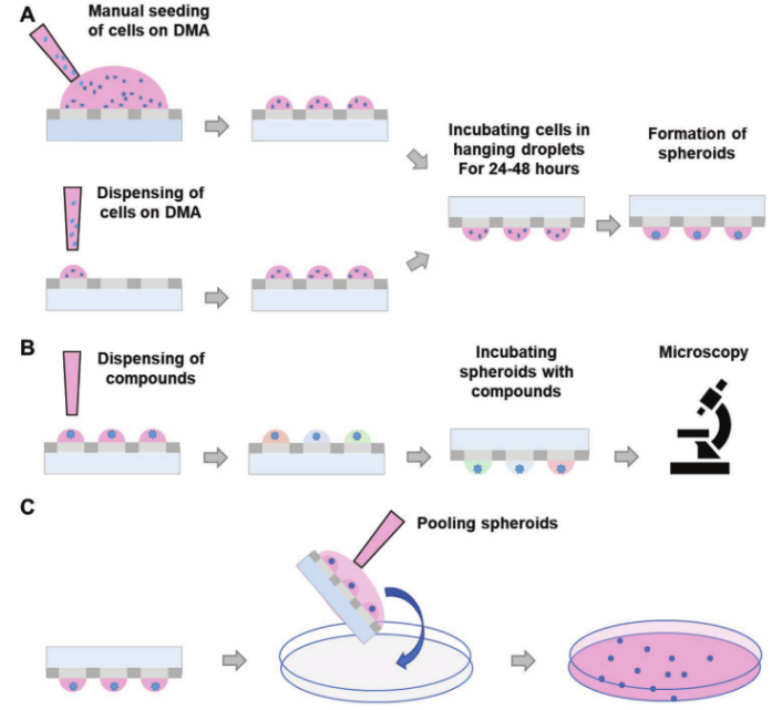 圖1. 示意圖展示了在液滴微陣列(DMA)平臺上制造和篩選球狀體。a)手動細胞接種和通過分配接種,然后在懸滴中生長球狀體。b)使用單球體微陣列的化合物篩選。c)匯集在DMA平臺上形成的球狀體。