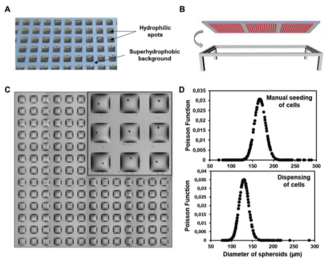 DMA平臺能夠在超疏水背景上形成均勻的親水點陣列,每個液滴中僅培養一個腫瘤球體,避免了傳統方法中多個球體共存導致的實驗誤差。