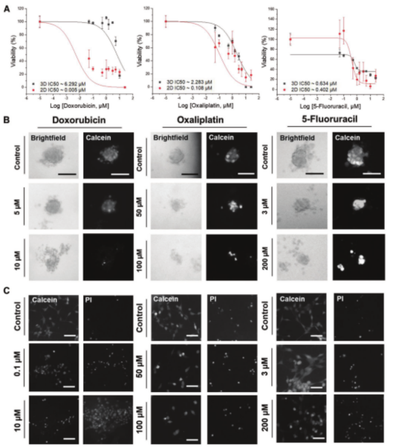用三種抗癌化合物(阿霉素、奧沙利鉑和5-氟尿嘧啶)對HeLa細胞形成的腫瘤球體進行處理,并與2D單層培養的HeLa細胞進行劑量-反應對比(圖4)。HeLa細胞以150個細胞/100 nL液滴的密度接種,培養48小時形成球體后進行藥物處理;2D培養的HeLa細胞接種后先培養5小時使其貼壁,再進行藥物處理。藥物處理72小時后,用鈣黃綠素和碘化丙啶(PI)染色觀察活細胞和死細胞。